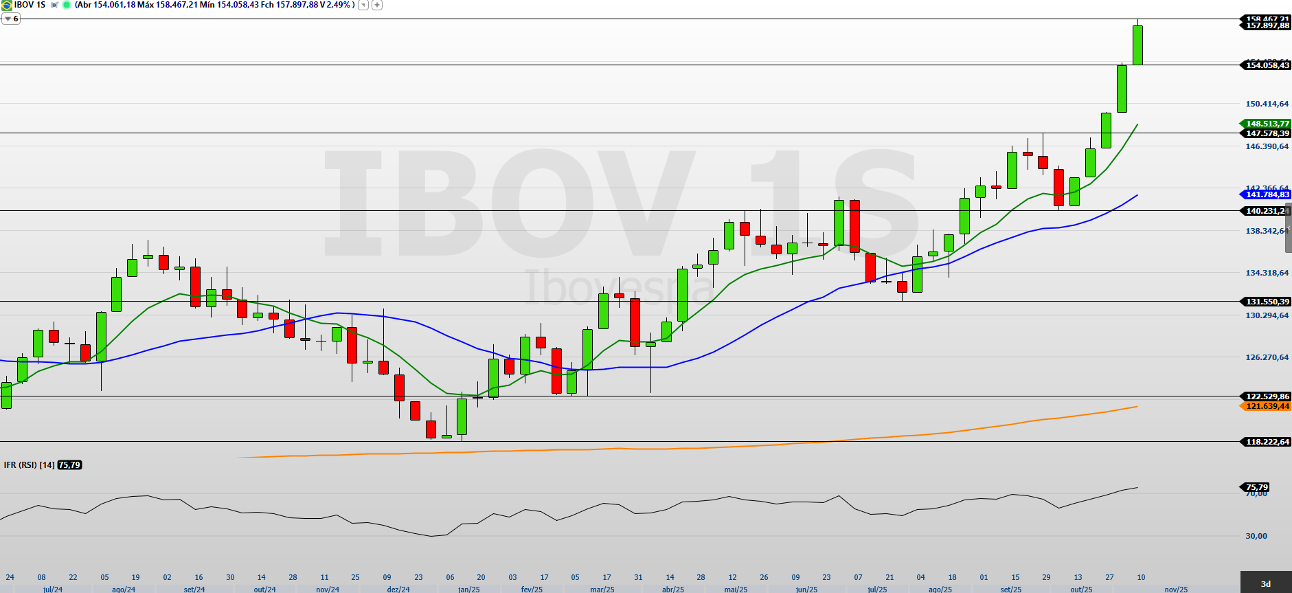 O rali recente levou o índice a registrar renovação da máxima histórica em 158.467 pontos e consolidar quatro meses consecutivos de alta até o momento. No entanto, o IFR (14) em 75,02 indica sobrecompra, reforçando a possibilidade de movimentos de ajuste — sem, contudo, alterar a tendência principal.