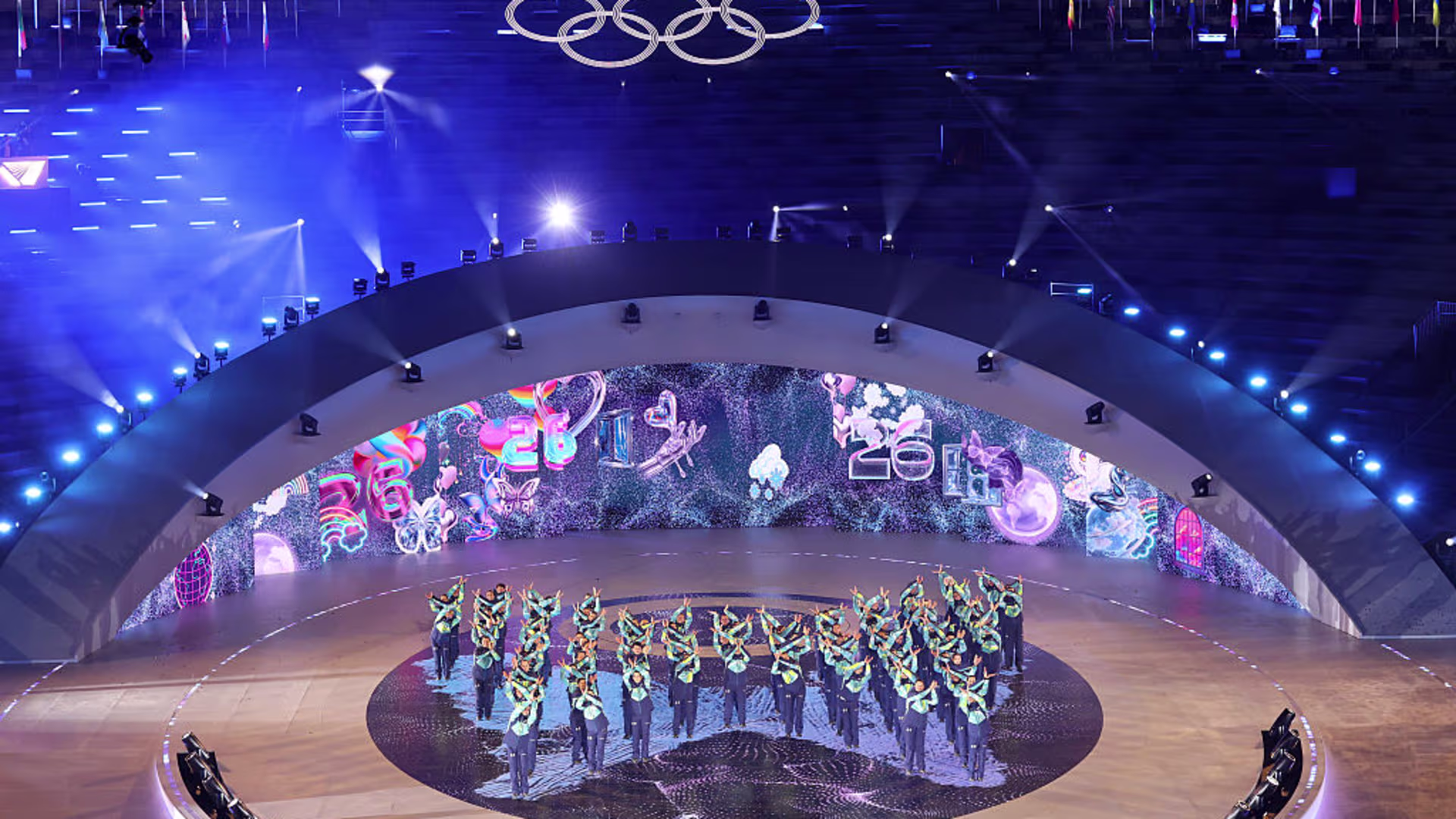 A bandeira olímpica foi passada pelos prefeitos de Milão e Cortina d’Ampezzo à Kirsty Coventry, que a repassou às autoridades da próxima sede dos Jogos de Inverno. A edição de 2030 será nos Alpes Franceses. Uma pequena orquestra de 12 músicos, conduzida pelo maestro francês Thomas Roussel, tocou o hino da França, cantado por Marine Chagnon.